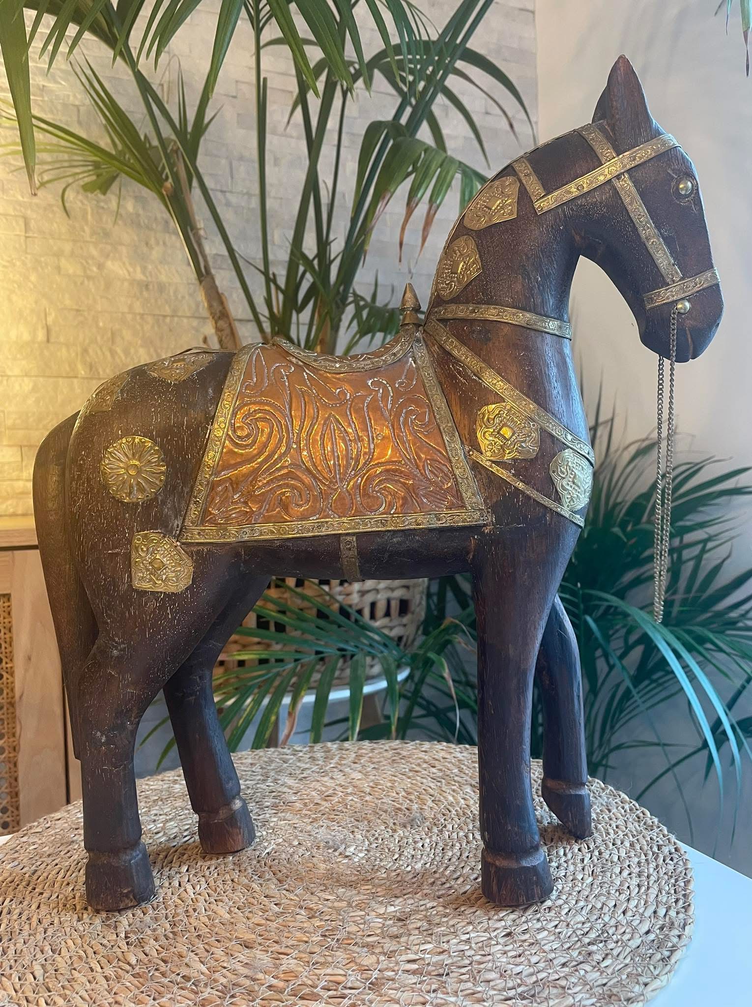 Statuette en bois indienne sculpté à la main , décorée de laiton et de cuivre.