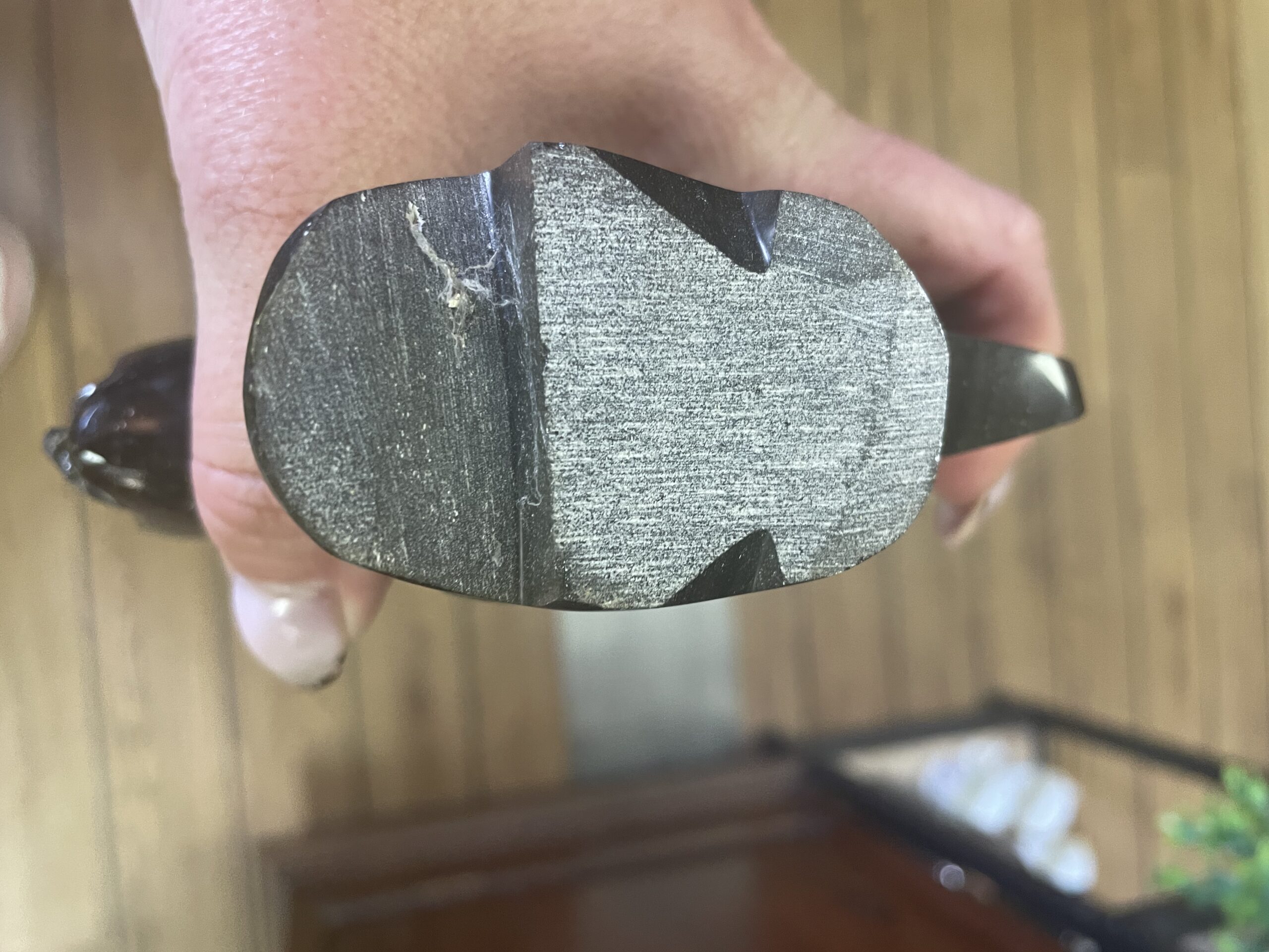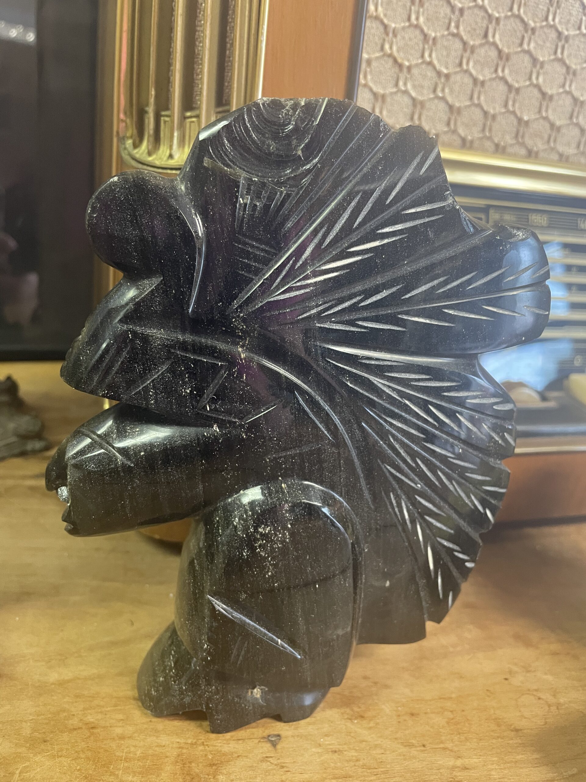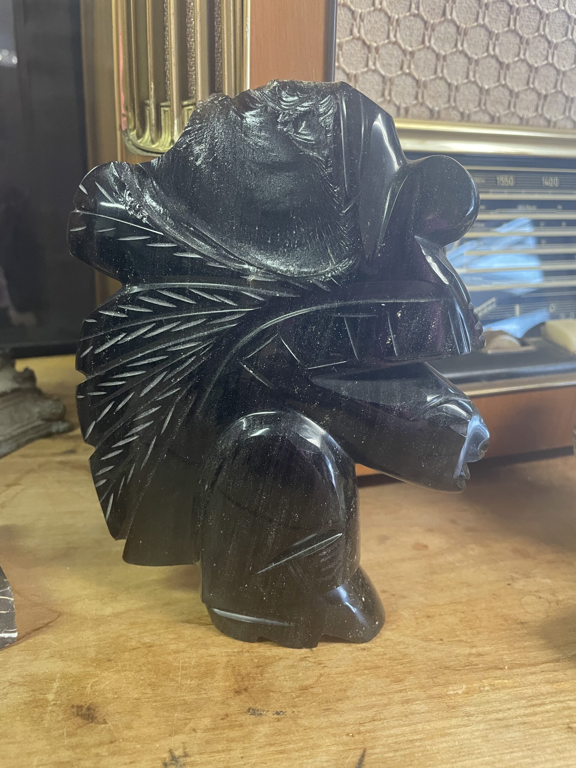 Belle sculpture obsidienne en pierre volcanique représentant un guerrier avec une grande coiffe à plume.